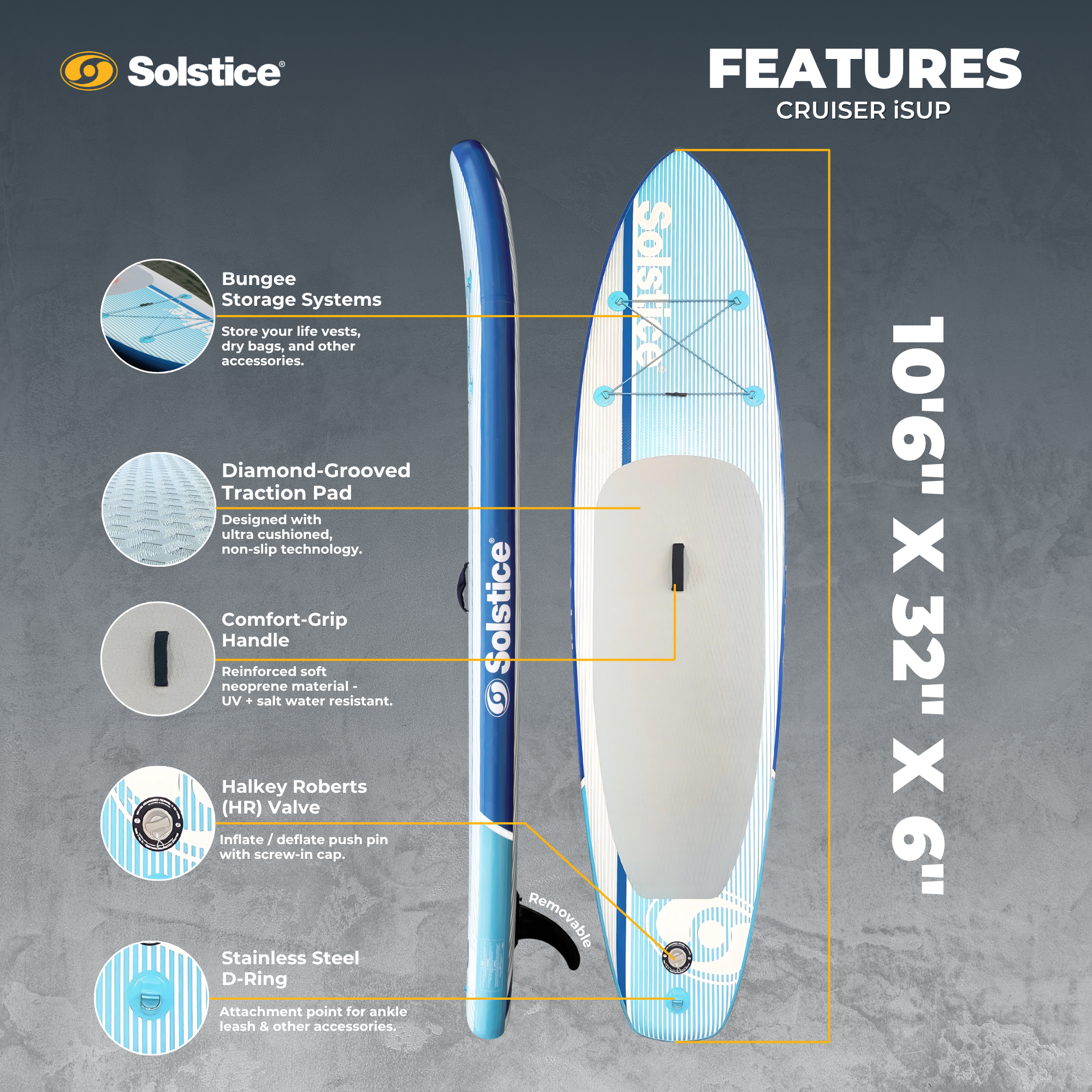 • Premium Performance SUP – 10'6" Cruiser paddleboard with 6" thick core and pointed nose design offers exceptional rigidity and smooth paddling, supporting riders up to 250lbs
