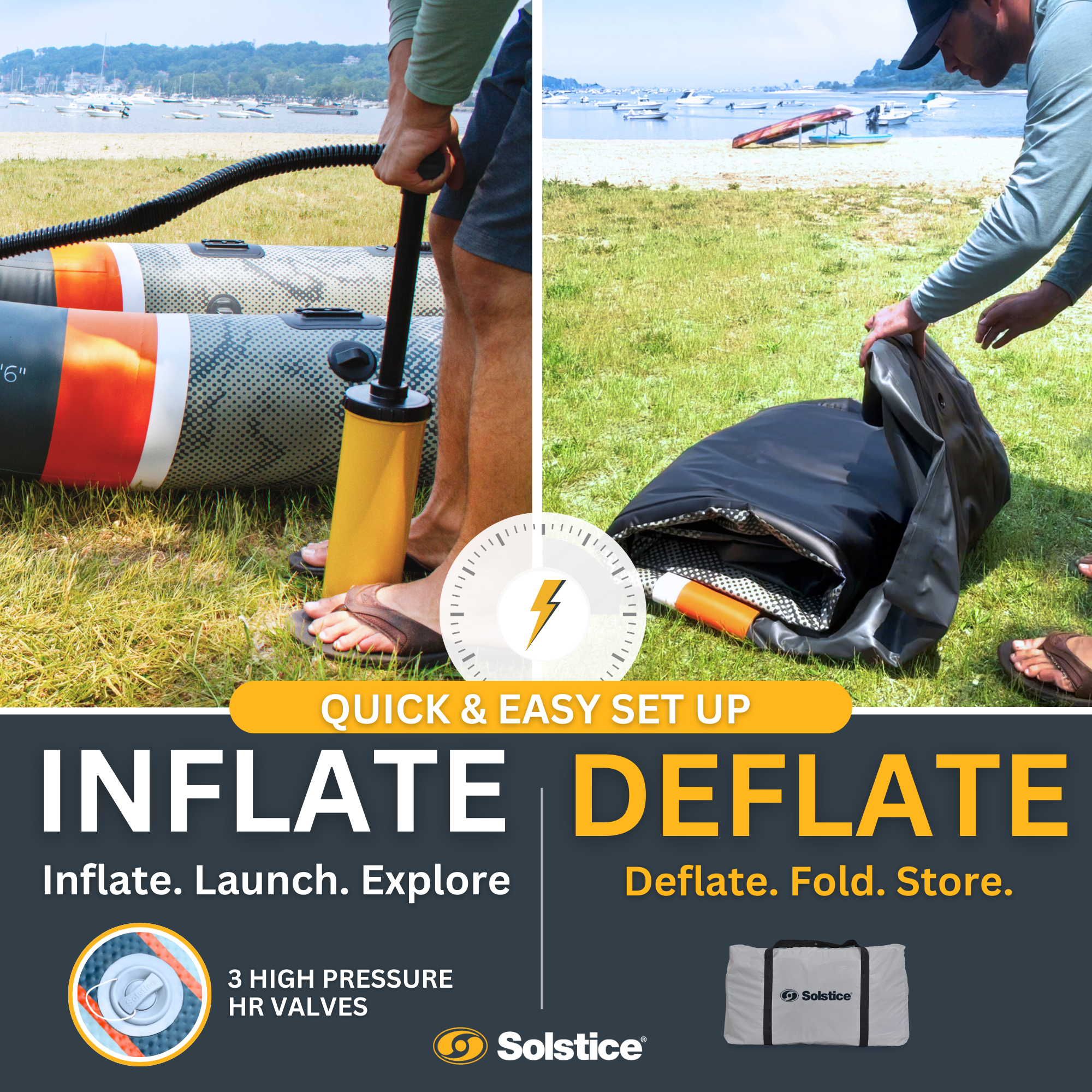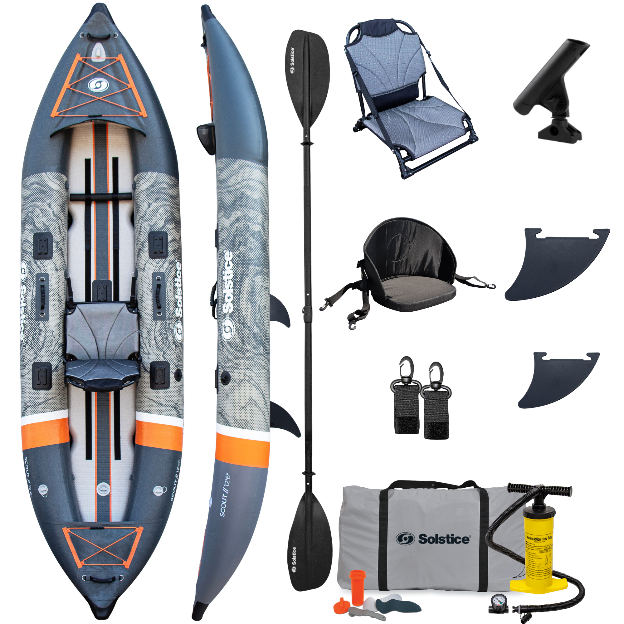 The Solstice Scout is a high-performance, premium fishing kayak. Equipped with five base mounts that are compatible with top-tier accessory brands, allowing for endless customization. Whether it's rod holders, motors, or cup holders, The Scout is ready to adapt to your needs on the water. Built with UV resistant, marine-grade PVC material and a high-pressure, drop-stitch floor, the Scout has a capacity of 500lbs with seating for two. The Scout Kayak includes 1 metal frame seat for superior comfort & 1 bucket seat if using as a tandem.