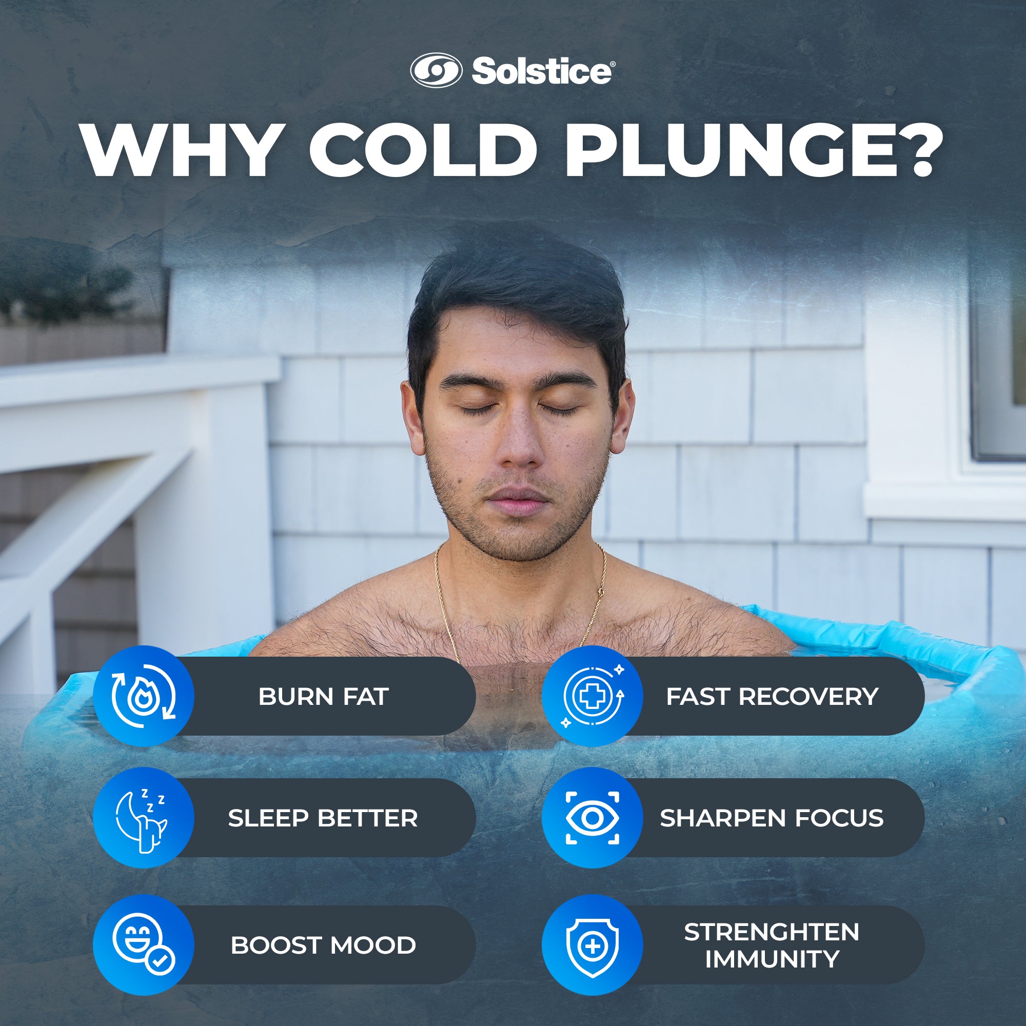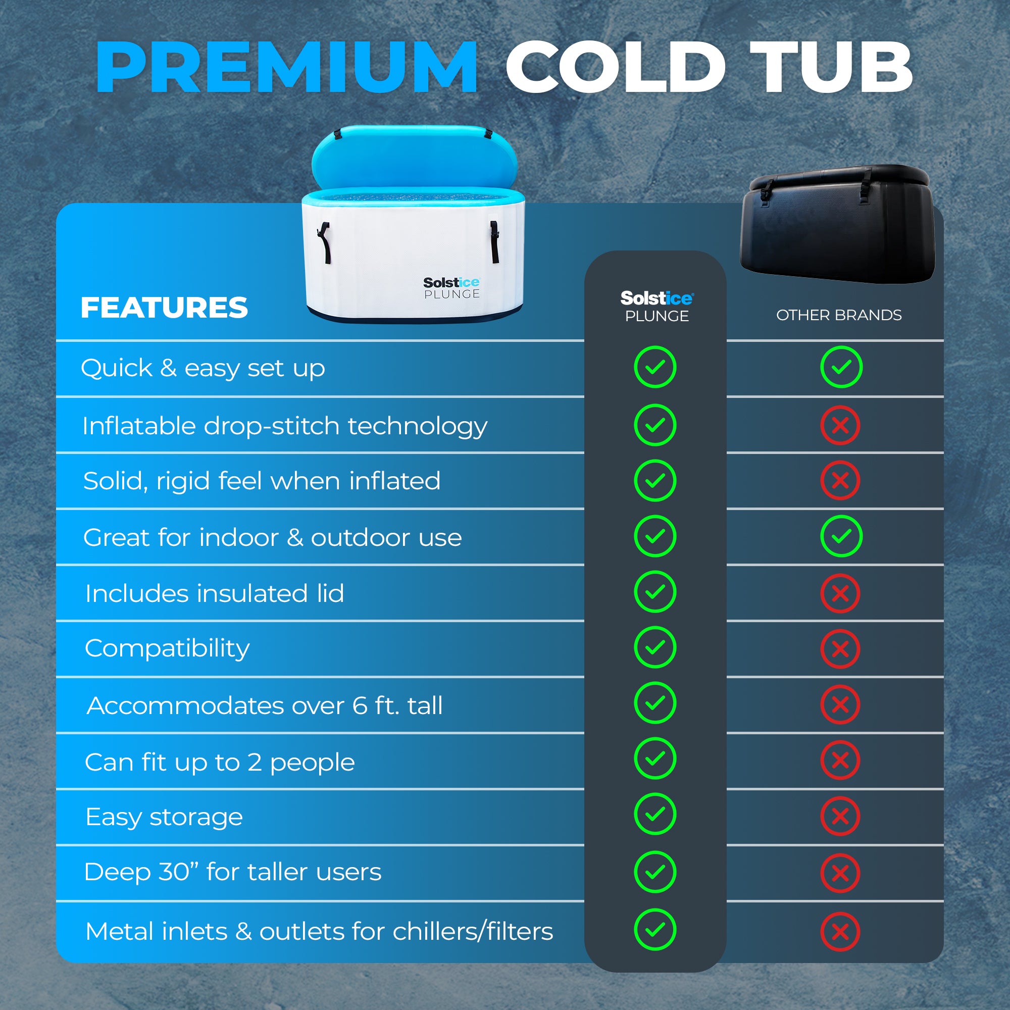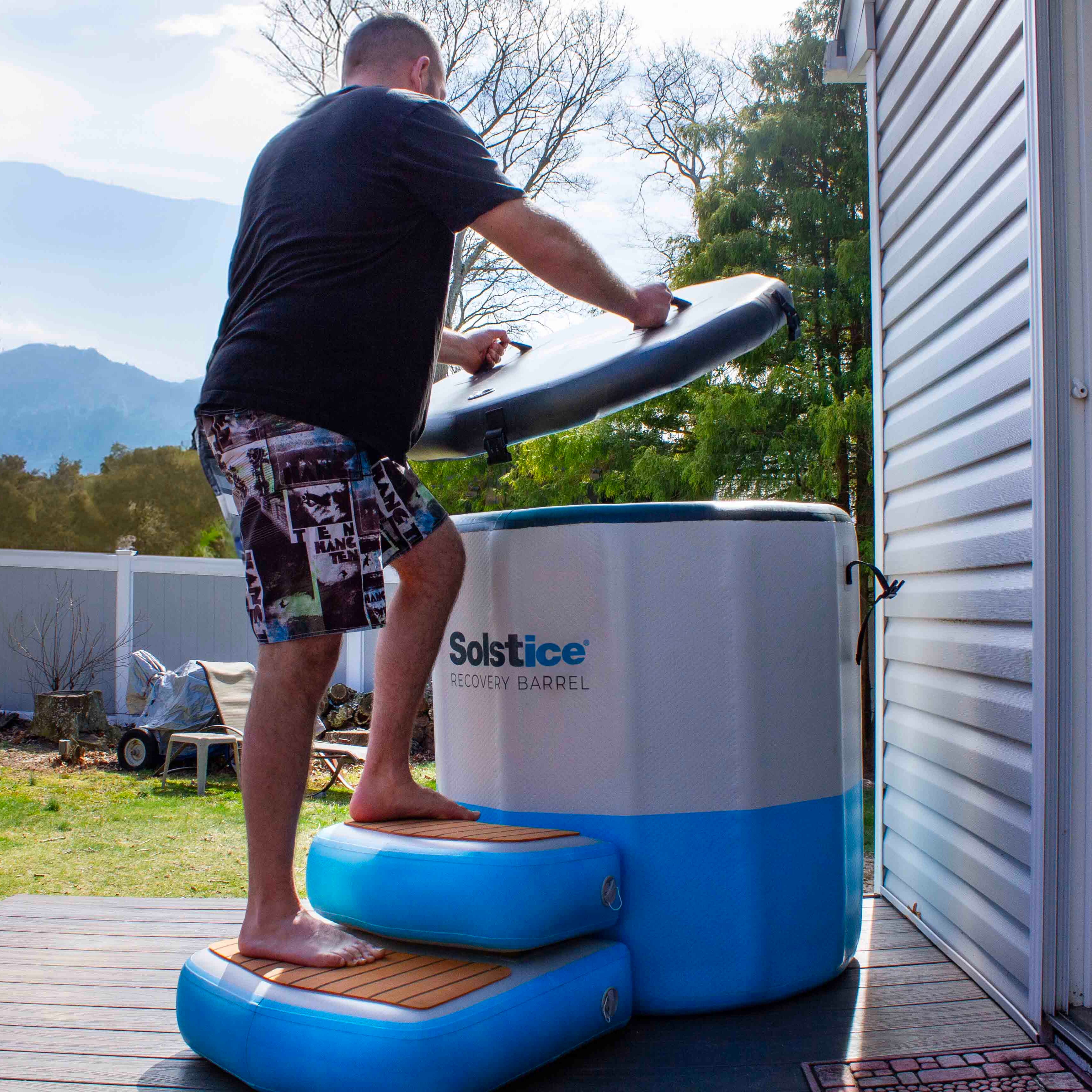 Unlock the power of cold therapy with Solstice's Cold Plunge Inflatable Tub. Designed with revolutionary Dropstitch technology, this inflatable tub maintains a constant water temperature and can be enhanced with accessories like filters, chillers, and heaters. Experience improved energy, alertness, and happiness levels, as well as the added benefits of improved blood flow, muscle recovery, weight loss, and enhanced skin and hair health.